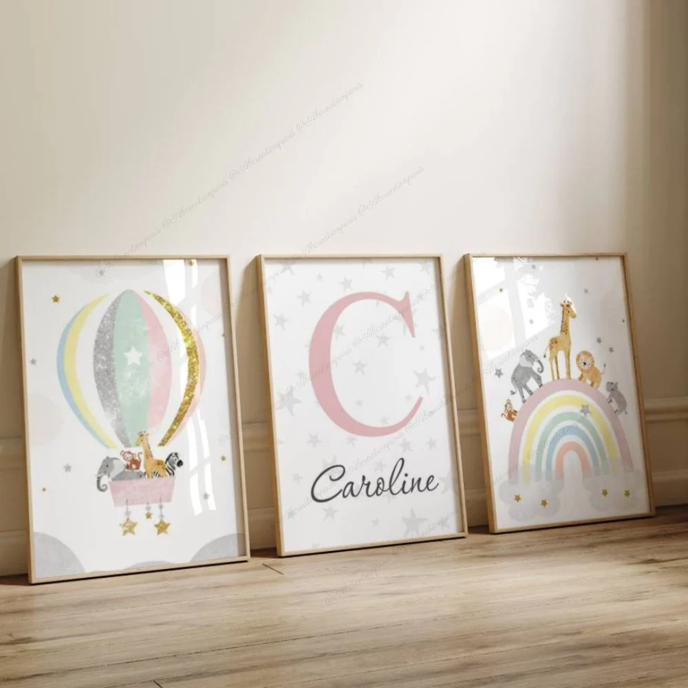 Affiche arc en ciel et montgolfière. Décoration chambre fille bébé ou enfant ! Idée de cadeau de Naissance personnalisé ou cadeau de Baptême. En cas de doute ou de demande, je suis disponible et je me ferais un plaisir de vous répondre ! ⚠️AFFICHE VENDUE SANS CADRE⚠️ Aurélie.