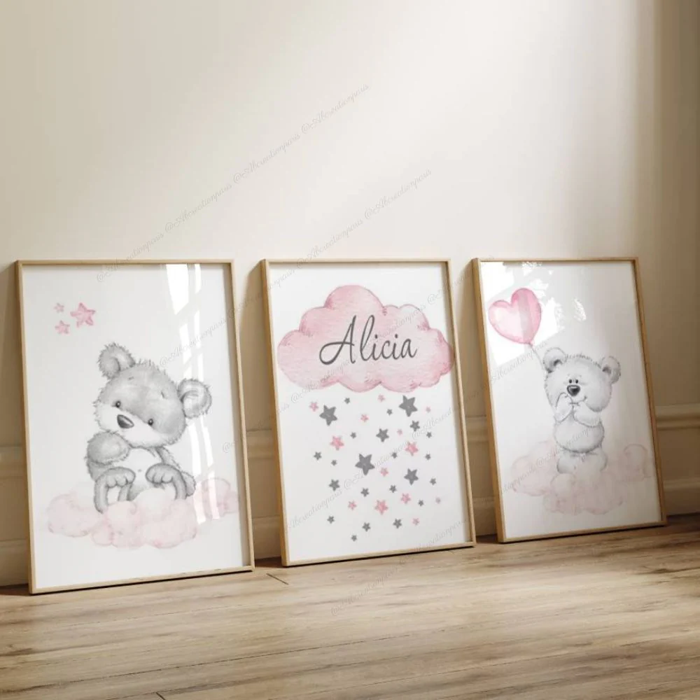 Ce charmant triptyque met en scène un ourson délicat aux couleurs douces, idéal pour embellir la chambre de bébé.