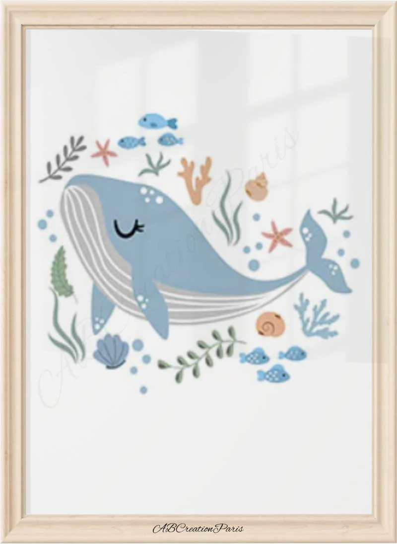 Décorer la chambre de bebe en ajoutant un visuel sur le thème des animaux de la mer. Le couleur bleu apportera douceur et harmonie dans la chambre d’une petit garçon ou d’une petite fille. Un nouveau-né dans votre entourage ?