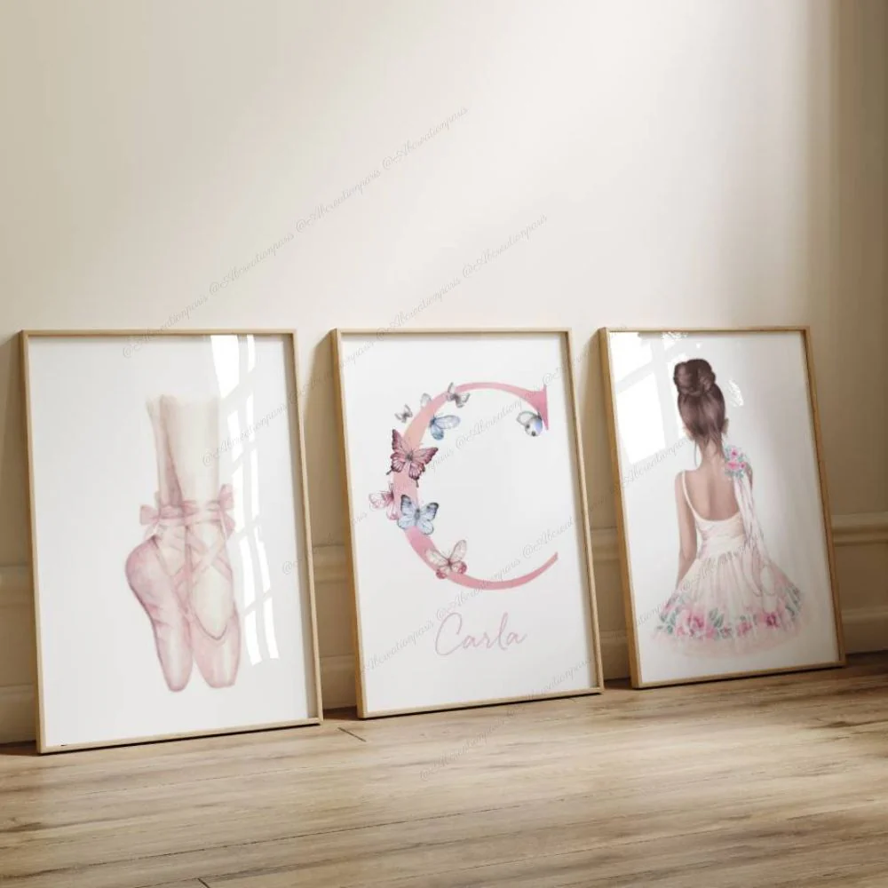 Créez un espace inspirant avec le set de 3 affiches sur le thème de la danse classique, parfait pour les jeunes passionnés. Avec une élégante ballerine, une paire de chaussons délicate et une affiche personnalisée avec l’initiale et le prénom de votre enfant, invitez la grâce et la beauté du ballet dans leur chambre.