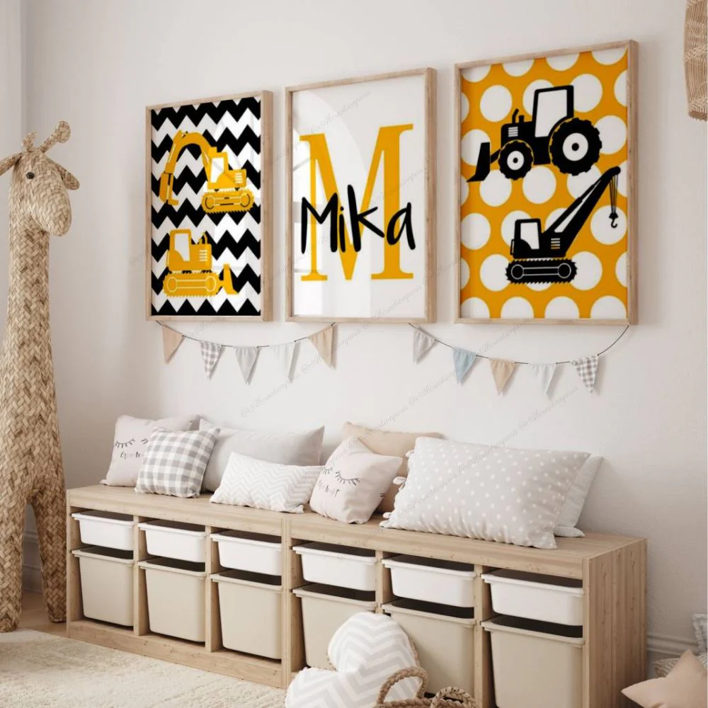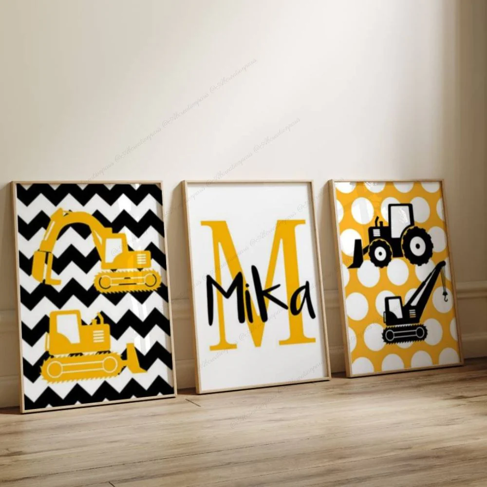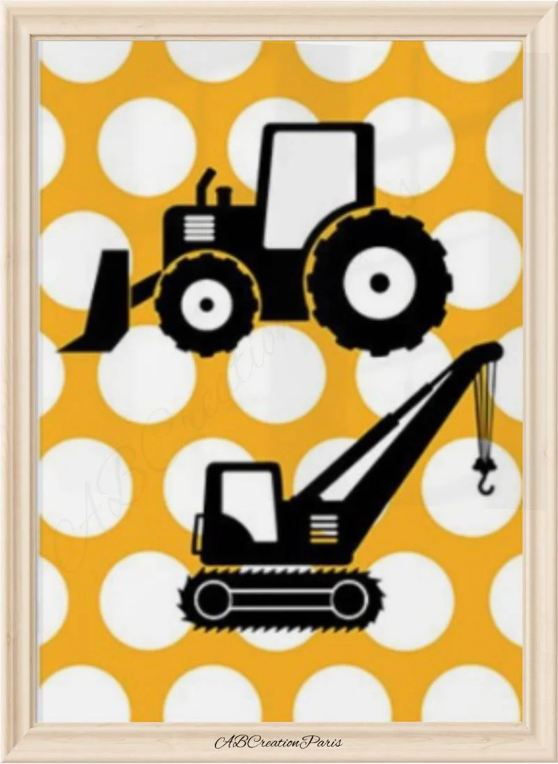 Parfaitement adaptée à une déco jaune chambre garçon, elle offre un univers fort, joyeux et affirmé. Offrez une affiche engin de chantier personnalisée qui fera briller les yeux des petits passionnés de tracteurs, pelleteuses ou grues dès leur plus jeune âge.