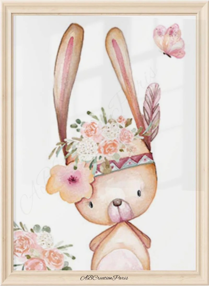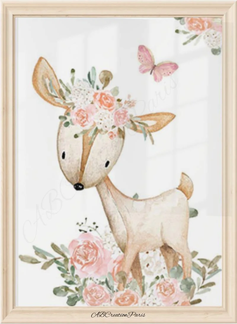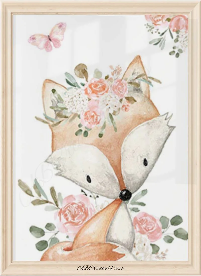 Décorer la chambre de bebe en ajoutant un visuel sur le thème des animaux de la forêt. Biche, Lapin, Renard et petites fleurs pour la chambre d’une petite fille. Une nouveau-né dans votre entourage? Faites-lui un cadeau de naissance unique et original. Un univers propre à lui, cela éveillera ses sens !