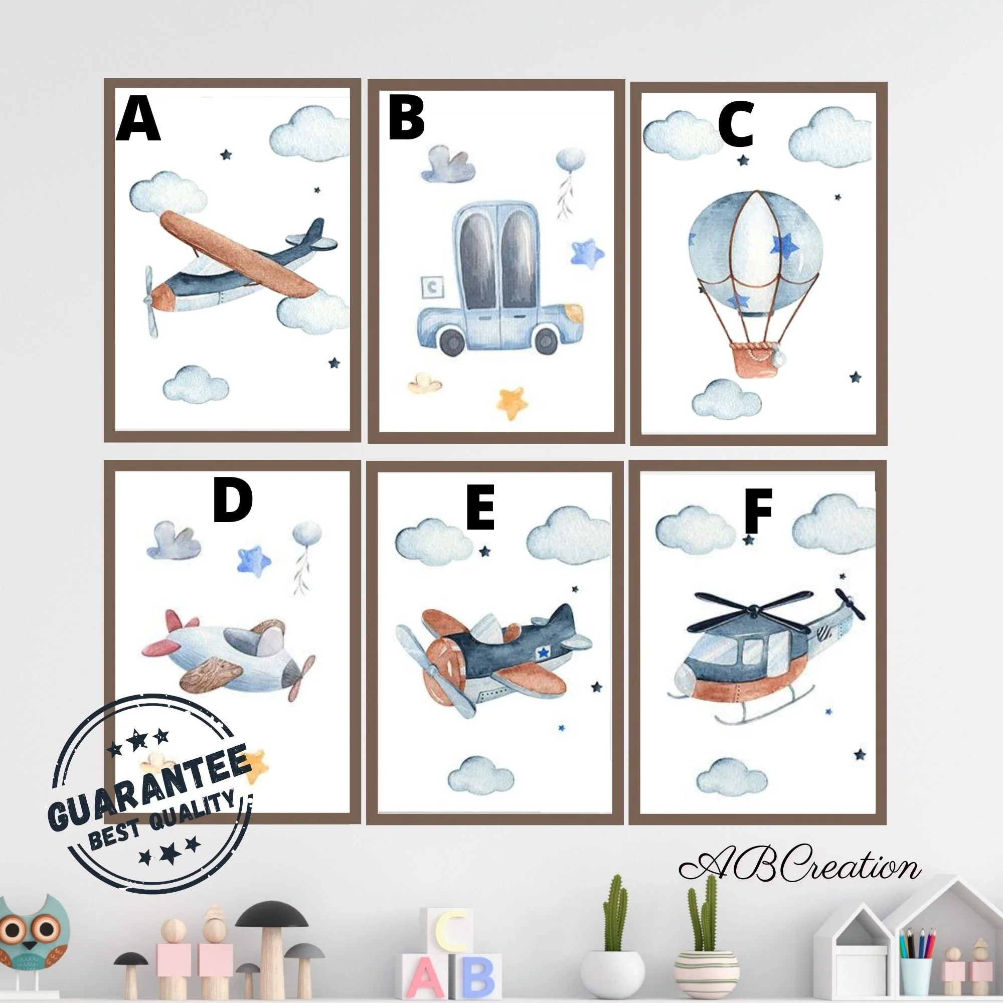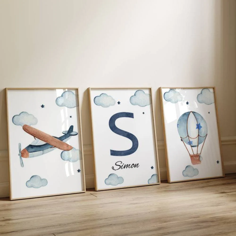 ★★ Set 3 affiches Avions Nuage et Prénom Personnalisée – Cadeau de Naissance – Décoration Murale pour la chambre de bébé – Décoration Chambre Bébé Garçon★★