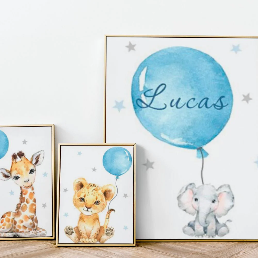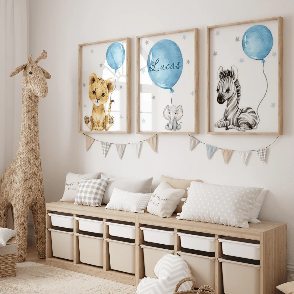 ★★ Set 3 Affiches Animaux Savane Ballons Bleu -Décoration Chambre Garçon -Cadeau de Naissance Bébé -Tableau Girafe Eléphant Zèbre ★★