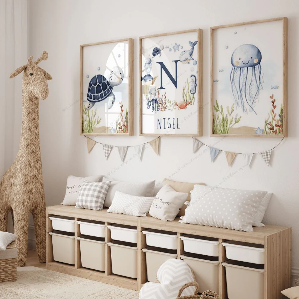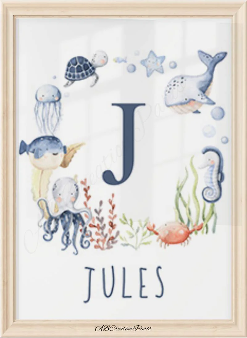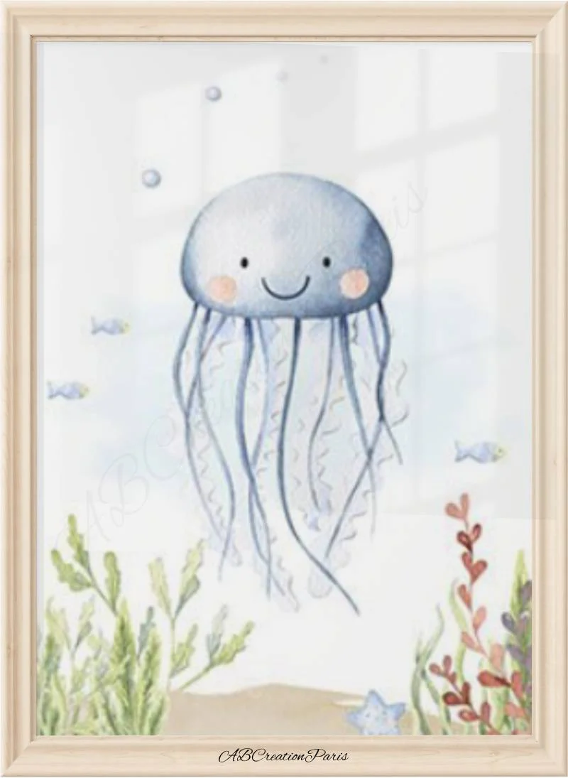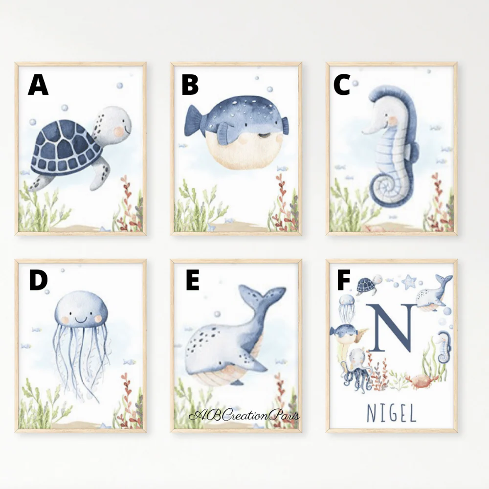 Décorer la chambre de bebe en ajoutant un visuel sur le thème des animaux de la mer. Le couleur bleu apportera douceur et harmonie dans la chambre d’une petit garçon. Un nouveau-né dans votre entourage ? Faites lui un cadeau de naissance unique et original. Un univers propre à lui, cela éveillera les sens de bebe !