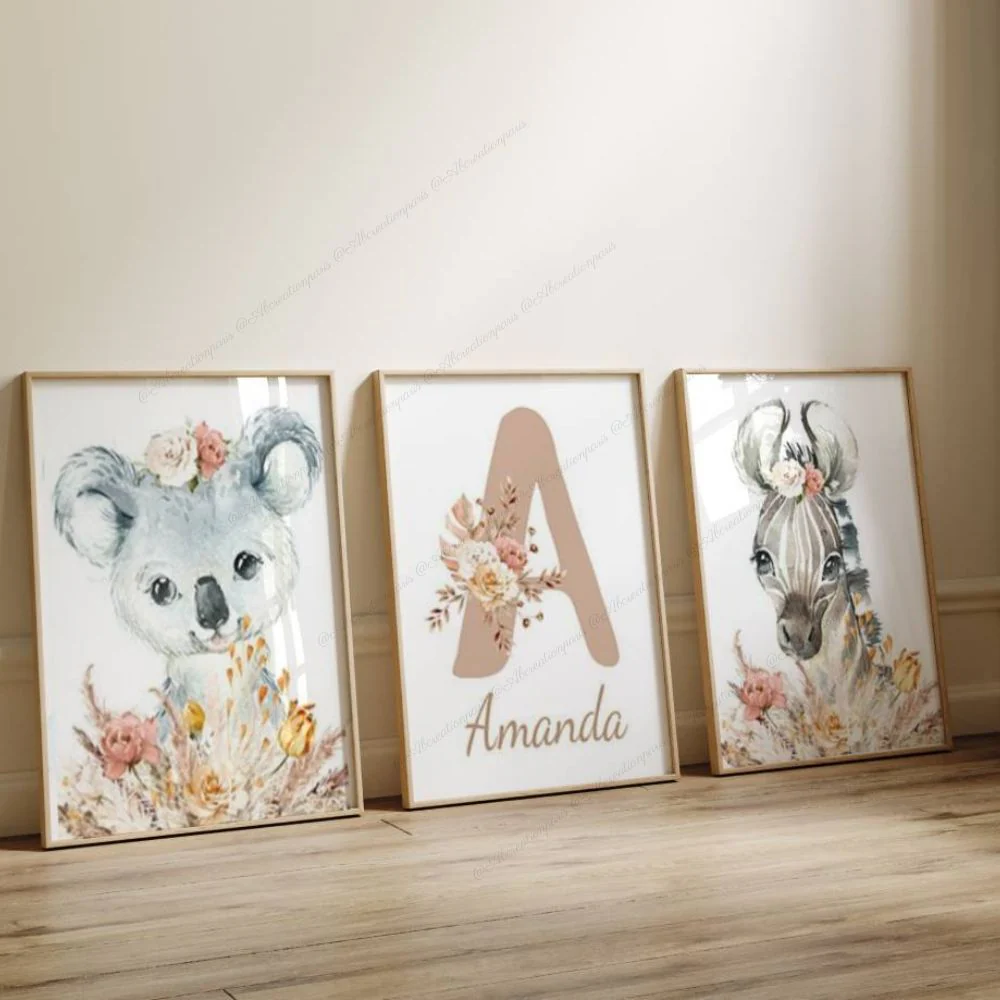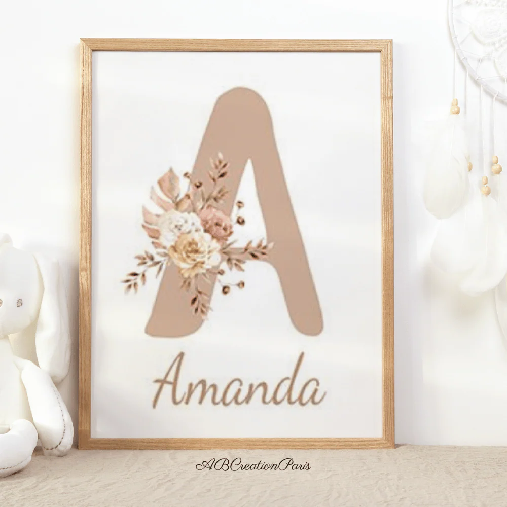 ★★ Lot de 3 Affiches Personnalisées Bébé – Cadeau de Naissance- Initiale Prénom bébé / Décoration chambre Motif Fleur ★★