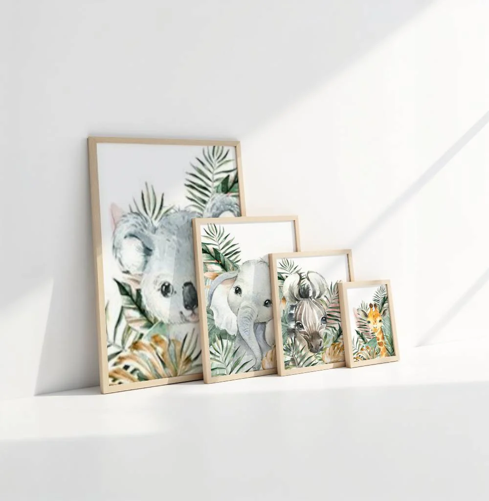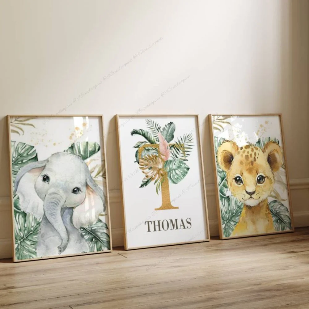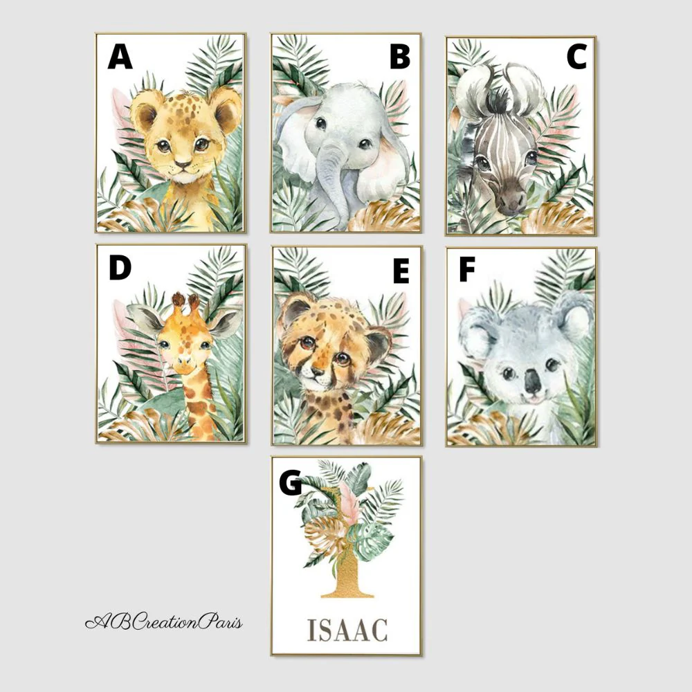 Décoration Savane pour Chambre Bébé Et Enfant- Affiches Avec Prénom Personnalisé et Initiale Or, Animaux et Feuillage – Ideal pour Chambre mixte