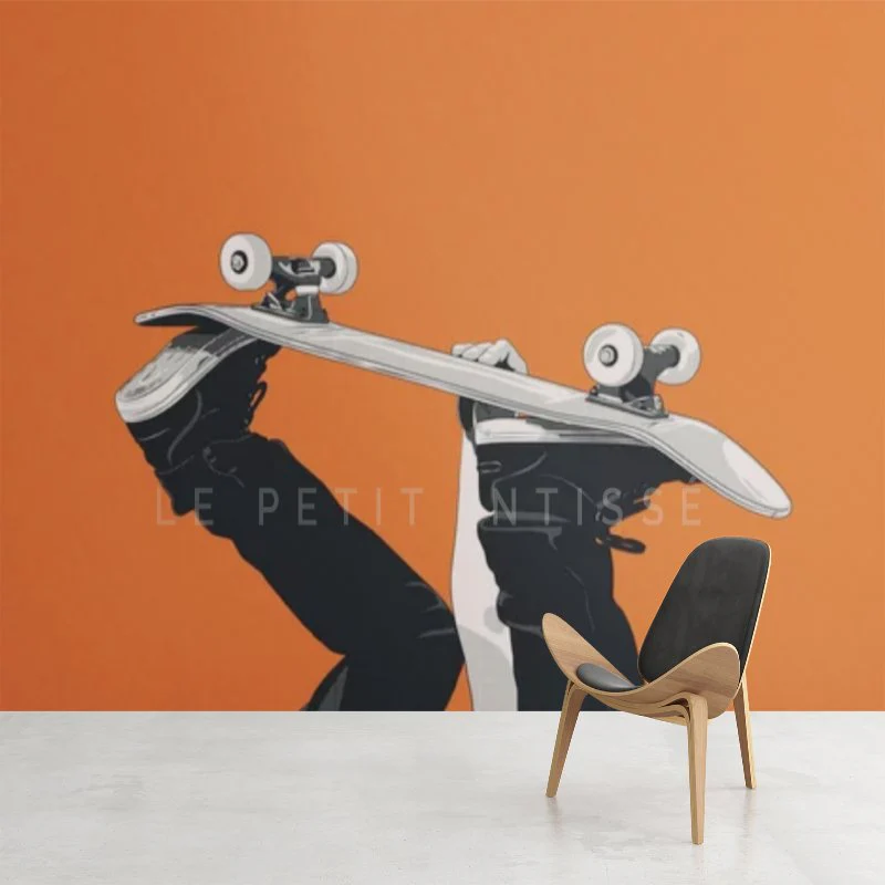 PAPIER PEINT SKATE SUR FOND ORANGE POUR UN EFFET VITAMINE ET JOYEUX. OPTEZ POUR UN STYLE UNIQUE ET FAITES DE SA CHAMBRE A COUCHER UN UNIVERS EPANOUI.