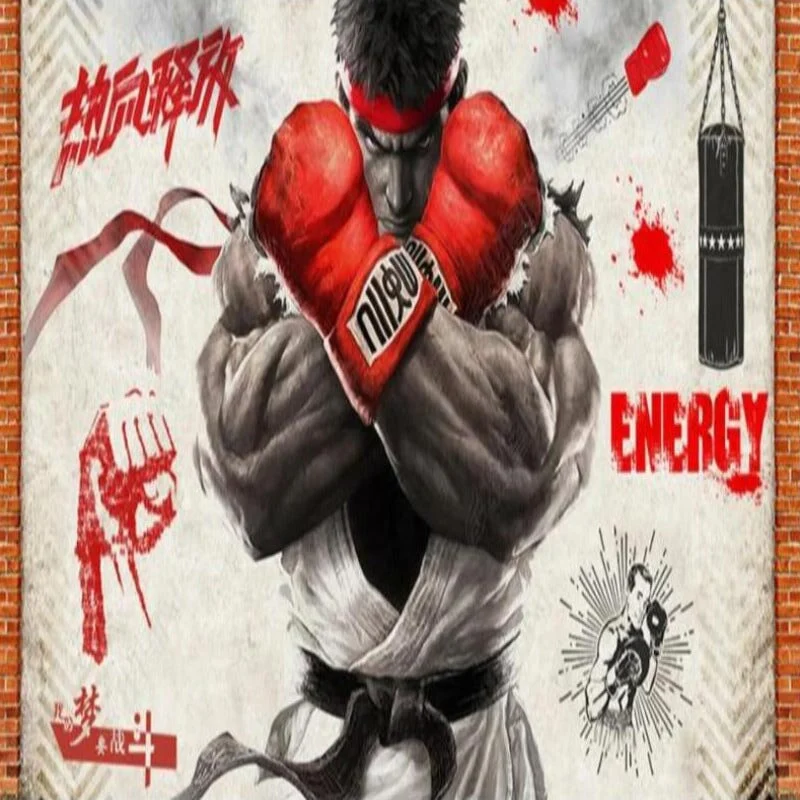 PAPIER PEINT STYLE SALLE DE SPORT AVEC PERSONNAGE EMBLEMATIQUE DE STREET FIGHTER. OPTEZ POUR CE STYLE PUISSANT ET COLORE.