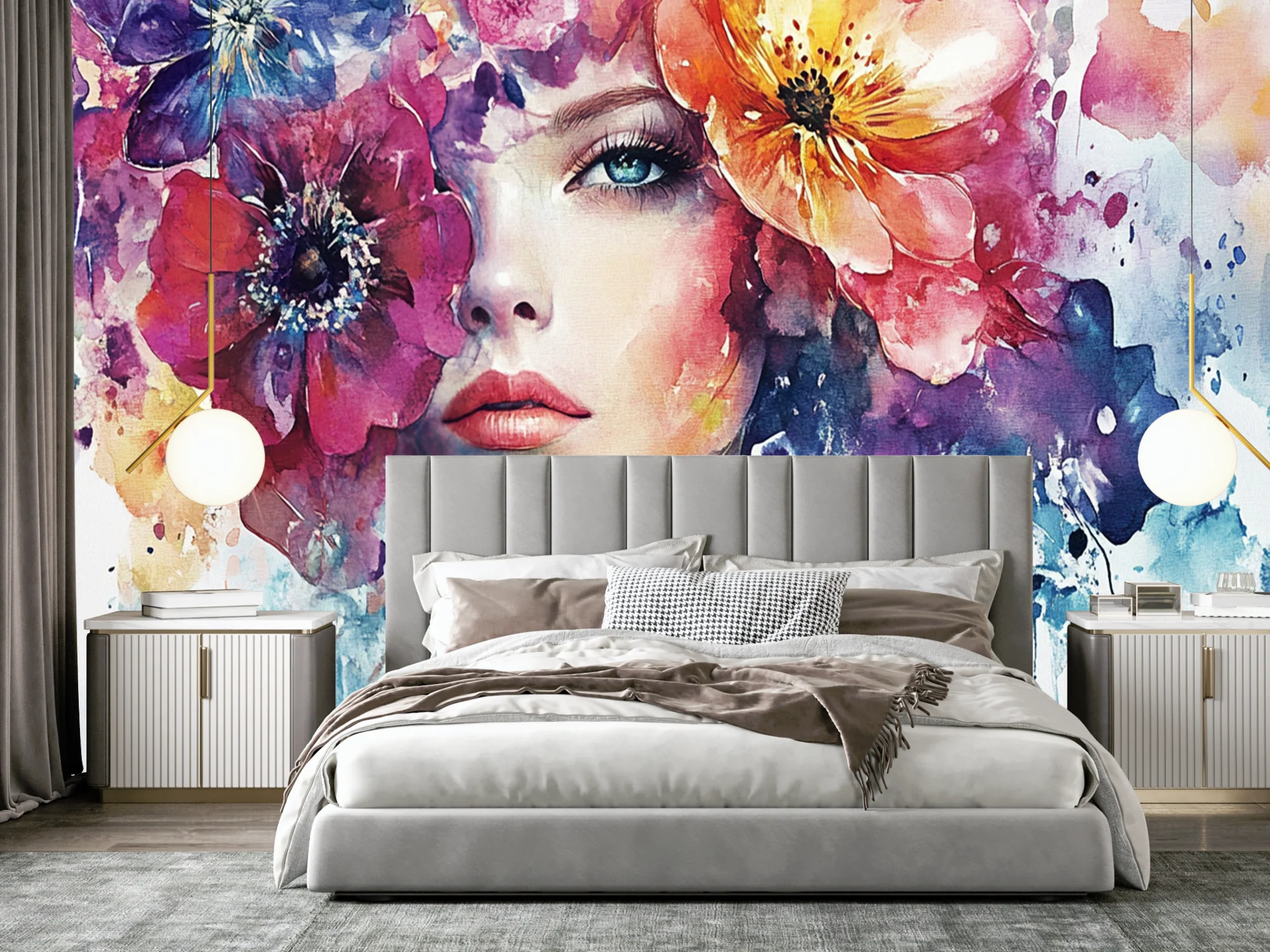 Ce design spectaculaire met en scène un visage féminin entouré de fleurs éclatantes, peint dans un style aquarelle vibrant. Idéal pour une chambre d’adolescente, il ajoute une touche de personnalité et de raffinement tout en sublimant l’espace.