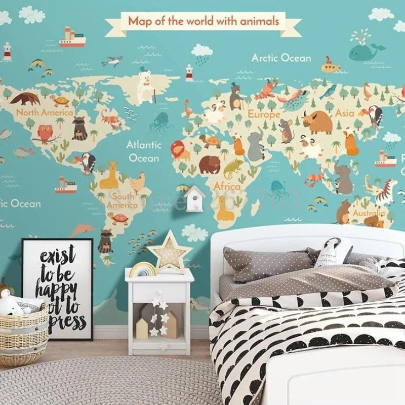 PAPIER PEINT PANORAMIQUE MAPPEMONDE POUR HABILLER ET TAPISSER LES MURS DE CHAMBRE DE VOTRE ENFANT. DE JOLIS MOTIFS COLORES ET UNE MAPPEMONDE BIEN FOURNIE POUR DECORER SELON VOS ENVIES. STYLE DE DECORATION MURALE MIXTE.