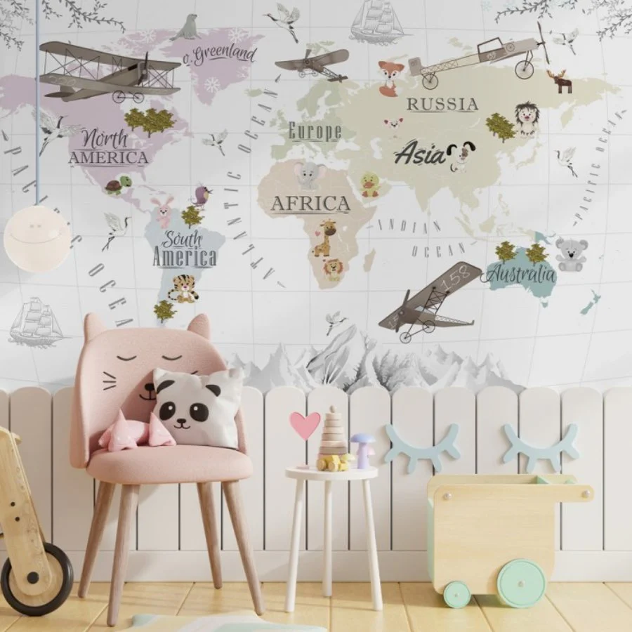 Offrez à votre enfant une expérience unique avec notre papier peint Carte du Monde Avion, Montagne et Animaux. Cette tapisserie est idéale pour décorer et personnaliser les murs de sa chambre. Grâce à son design ludique et éducatif, votre enfant découvrira le monde en s’amusant.