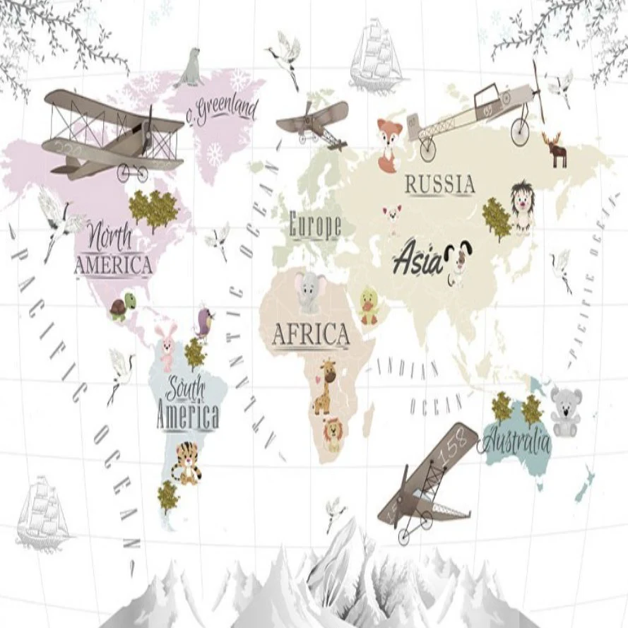 Papier Peint Carte du Monde Avion, Montagne et Animaux