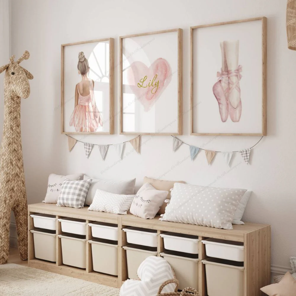 - Designs Exclusifs : Chaque affiche représente une élégante ballerine de dos, une paires de chaussons et un cœur, tous parées de couleurs douces et apaisantes qui s’harmonisent parfaitement avec tout décor de chambre fille.