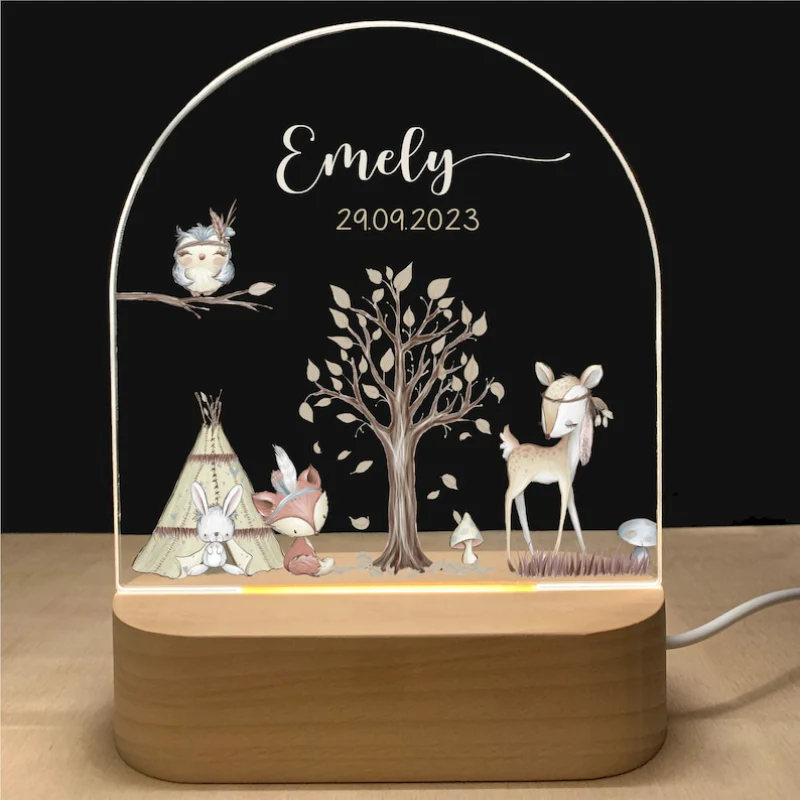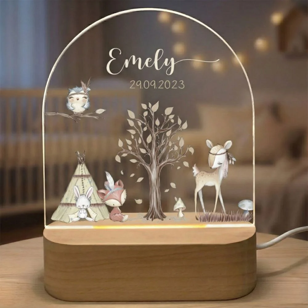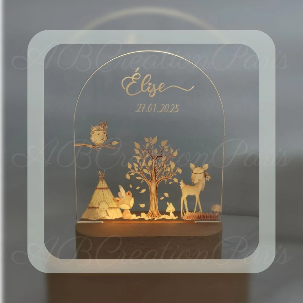 Créez une ambiance magique dans la chambre de votre enfant avec cette veilleuse représentant des animaux de la forêt. Idéale pour apaiser et rassurer votre enfant la nuit, cette veilleuse peut être personnalisée avec le prénom et la date de naissance.