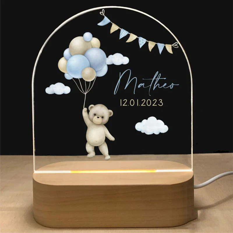 Créez une atmosphère magique dans la chambre de votre bébé garçon avec cette veilleuse personnalisable. Illustrée d’un ourson tenant des ballons bleus, elle peut être personnalisée avec le prénom et la date de naissance de votre enfant. Parfaite pour des nuits paisibles et rassurantes.